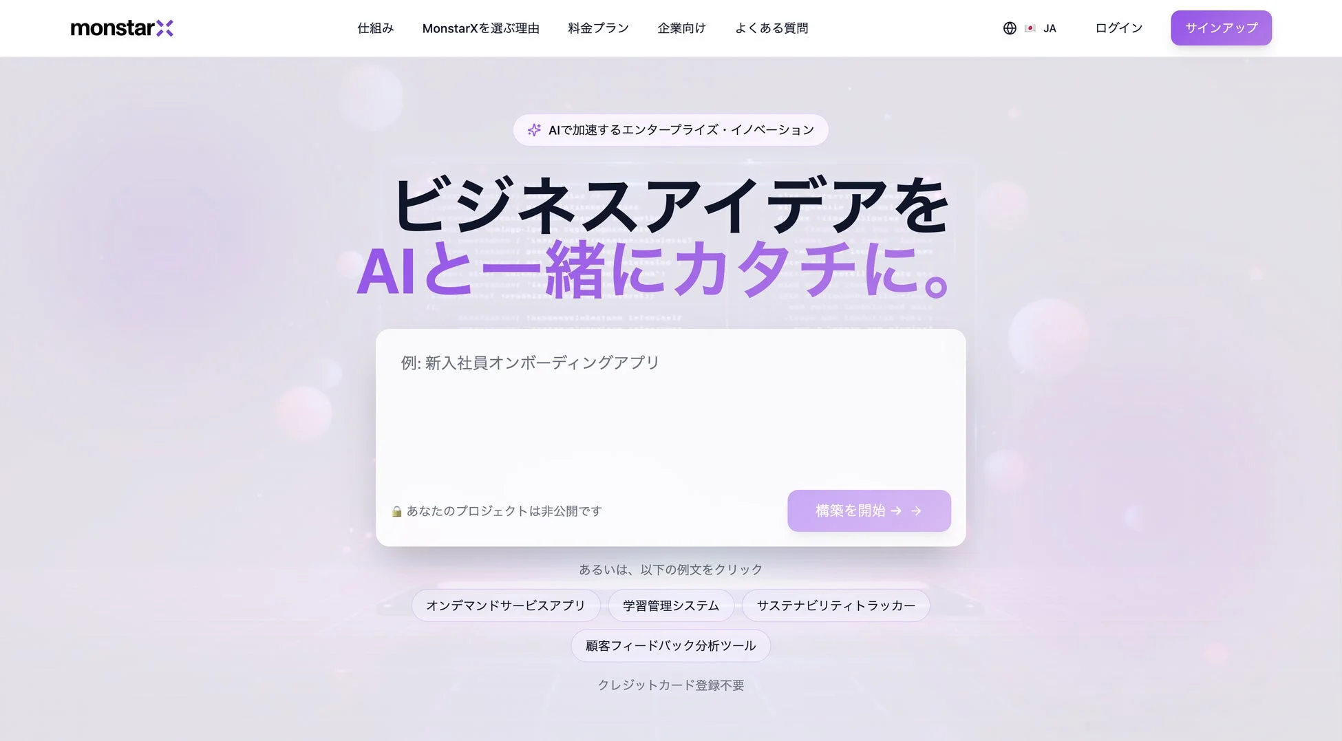 「MonstarX」は、AIとの対話を通じて、コーディングやプロンプト設計の専門知識がない方でも、アイデアを実証レベルの高度なプロトタイプとして容易に構築できるSaaS型プラットフォームです。