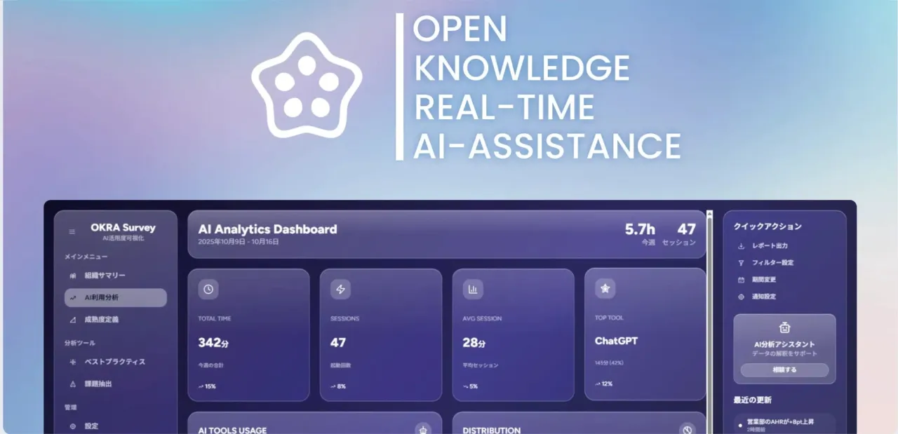 「OKRA」は、PC業務にリアルタイムでAI活用のヒントを提供するAIアシスタントであり、AIを「導入する」だけでなく「活用が定着する組織」を構築するためのOS(基盤)として設計されています。
