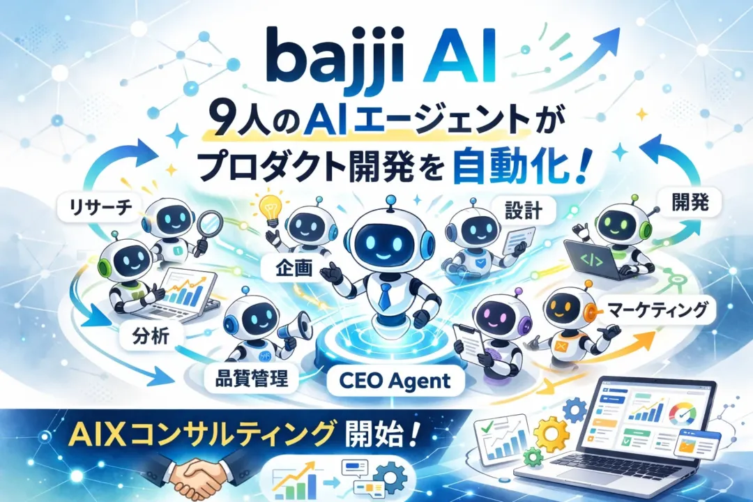 bajji AI事業部では、自社で構築した9エージェントシステムの技術と知見を活かし、企業のAI導入を包括的に支援する「AIXコンサルティング」事業を開始しました。このサービスは、AI導入を個別ツールの利用から「AIと働く組織設計」へと進めることを目指しています。