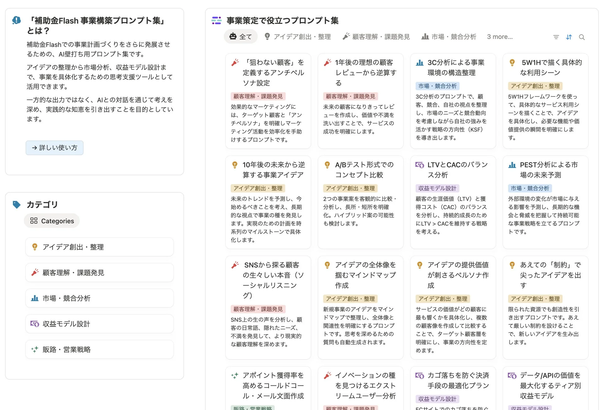 このプロンプト集はクラウドサービス「補助金Flash」内からアクセスでき、以下のようなテーマに分類されています。