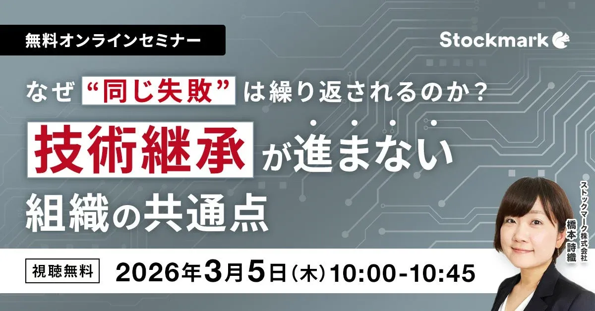 ストックマーク株式会社は、2026年3月5日(木)にオンラインセミナー『なぜ同じ失敗は繰り返されるのか?技術継承が進まない組織の共通点』を開催します。