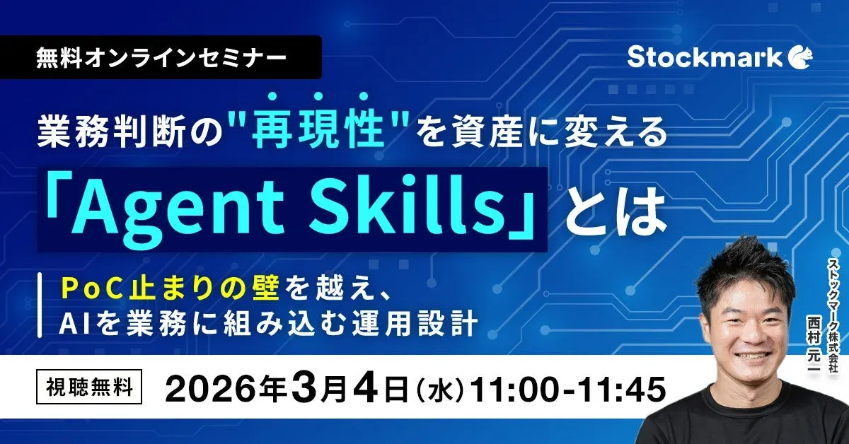 今回のストックマーク社によるセミナーは、生成AIがPoCの段階で停滞しがちな企業にとって、具体的な次の一手を示すものとして非常に重要です。「Agent Skills」という概念は、単にAIをツールとして使うのではなく、業務判断の再現性を高める「組織の資産」として位置づける視点を提供します。これにより、ベテラン社員の持つ暗黙知を形式知化し、属人化の解消や業務効率化に直結する可能性を秘めているでしょう。特に、判断のばらつきや手戻りが多い業務プロセスにおいて、AIがその精度と速度を向上させることで、企業の競争力向上に大きく貢献することが期待されます。