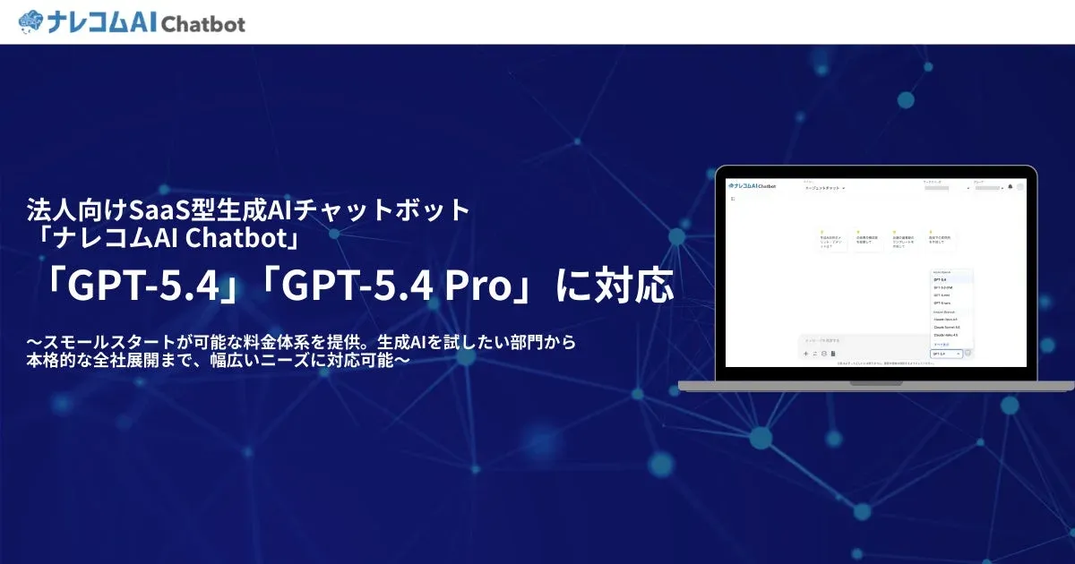 「ナレコムAI Chatbot」は、チャット機能、データ分析機能、社内文書検索機能などをワンプラットフォームで提供する法人向け生成AIサービスです。高いセキュリティ基準を備えており、企業での安全なAI活用を支援しています。今回のアップデートにより、ユーザーは用途に応じてOpenAI社の最新フロンティアモデルであるGPT-5.4およびGPT-5.4 Proを選択できるようになり、高度な推論を要する業務やエージェント型ワークフローの構築を加速させることが期待されます。
