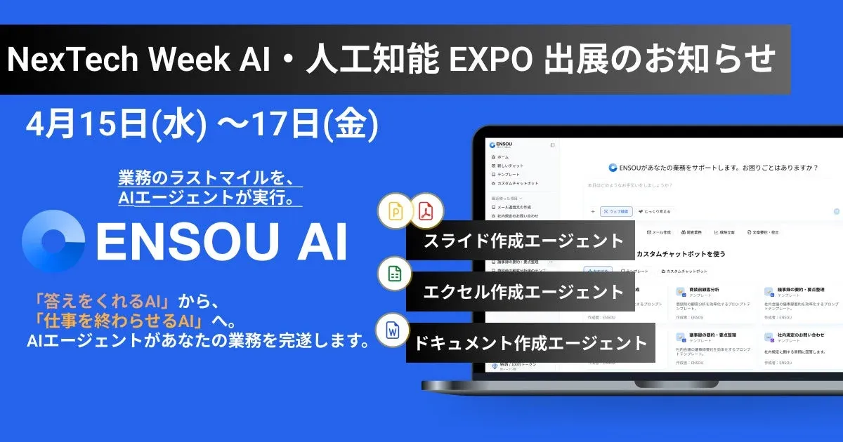 ENSOU AIは、単なる情報検索や回答に留まらず、資料作成や情報整理といった業務のアウトプットまでをAIが担う「業務完遂型AIエージェント」です。現場で自然に利用され、具体的な成果につながるAI活用の考え方が紹介されます。