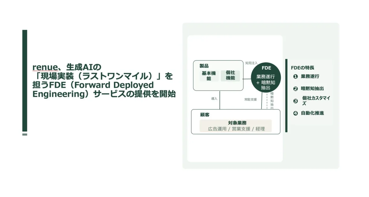 renueは、FDE(Forward Deployed Engineering)の対応業務領域を拡大し、広告運用・営業支援・経理・人事など多様な業務でのFDEサービスを展開していくとしています。暗黙知の抽出精度をさらに高め、個社カスタマイズのサイクルを加速させ、製品の基本機能と個社機能の両輪で、より少ない人的リソースで高い業務改善効果を実現する体制を構築するとのことです。
