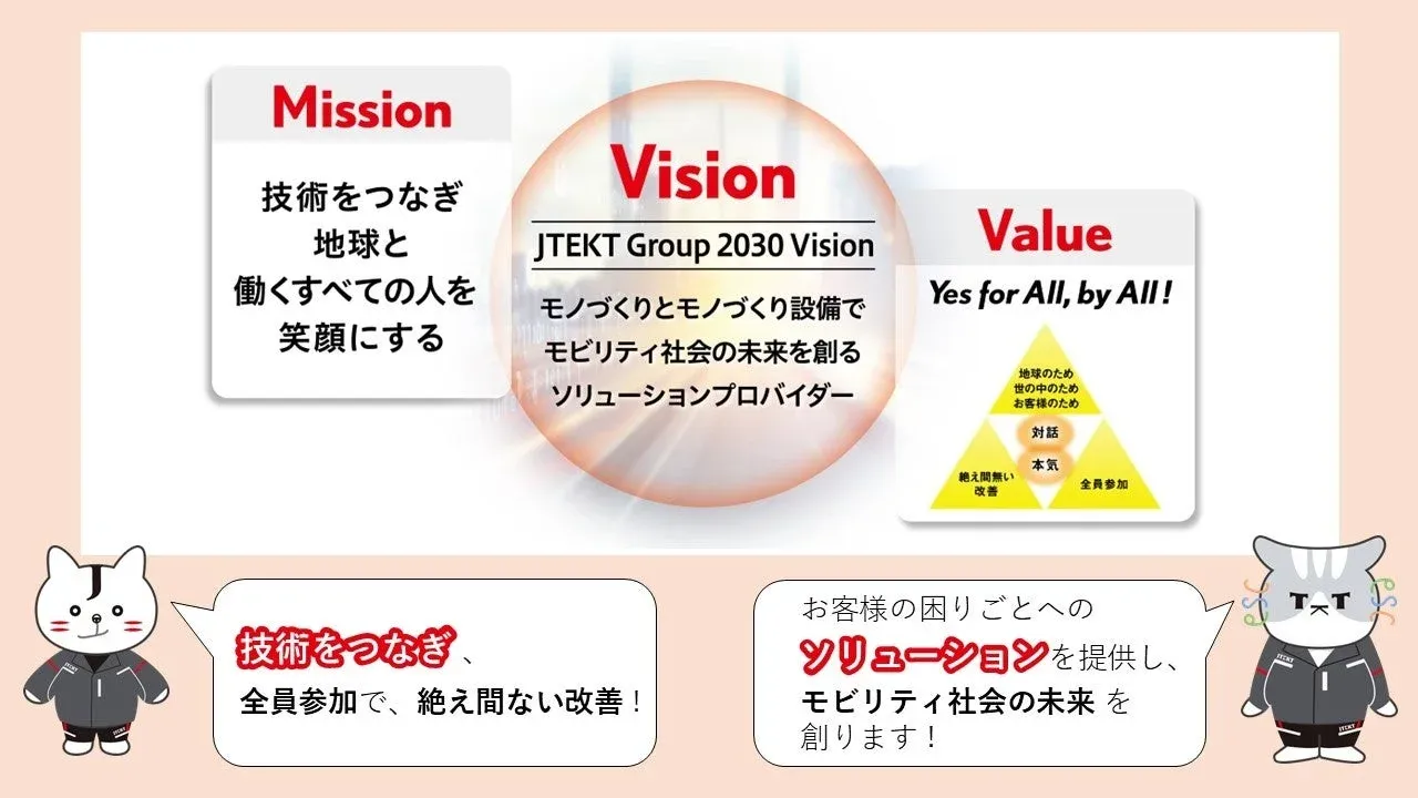 ジェイテクトグループは「技術をつなぎ、地球と働くすべての人を笑顔にする」というミッションのもと、2030年までに「モノづくりとモノづくり設備でモビリティ社会の未来を創るソリューションプロバイダー」となることを目指しています。