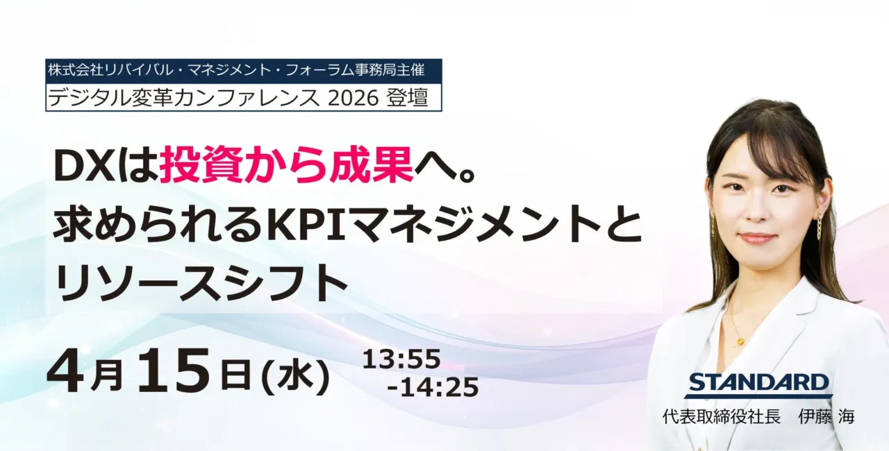 株式会社STANDARDは、2026年4月15日(水)にオンライン開催される「デジタル変革カンファレンス2026」(主催:株式会社リバイバル・マネジメント・フォーラム事務局)に、代表取締役社長の伊藤海氏が登壇することを発表しました。同社は、大手企業を中心に1,500社以上のデジタルトランスフォーメーション(DX)推進と内製化を支援する実績を持っています。