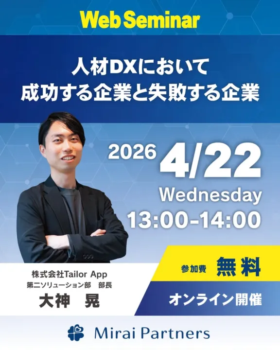 本ウェビナーでは、中小企業へのAI活用支援や実践的なリスキリングプログラムを提供する株式会社Tailor App(https://www.tailorapp.jp/)より、第二ソリューション部 部長の大神 晃氏が登壇します。数々の現場で培われた知見に基づき、「人材DXの成功事例・失敗事例」を交えながら、企業がAIやDXを進める真の意義を徹底的に解説します。