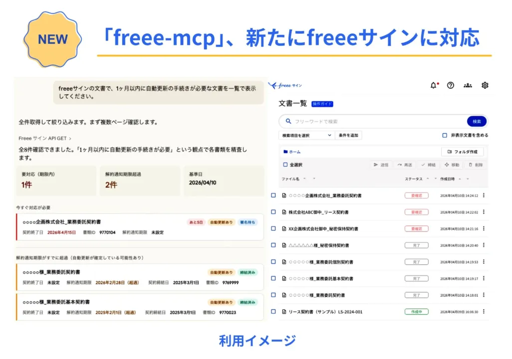 「freee-mcp」がfreeeサインに対応したことで、具体的な業務効率化が期待されます。例えば、「freee販売」から連携して作成した契約書が現在どのような締結状況にあるかを、MCP経由でAIに問いかけるだけで即座に一覧で確認できるようになります。これにより、販売と契約ステータスの一元管理が実現し、契約更新手続きの漏れ防止や進捗管理の効率化に貢献します。