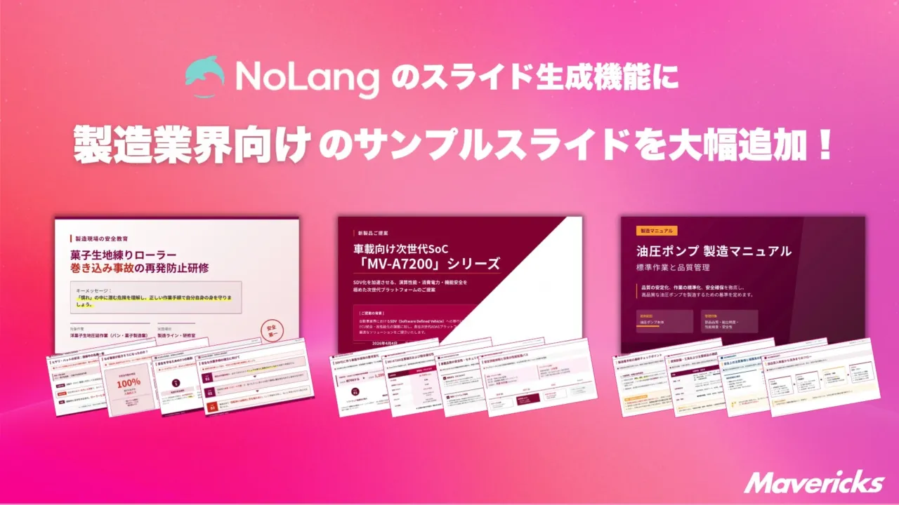 これらの課題に対応するため、NoLangはスライド生成機能に製造業向けのサンプルスライドを新たに追加しました。