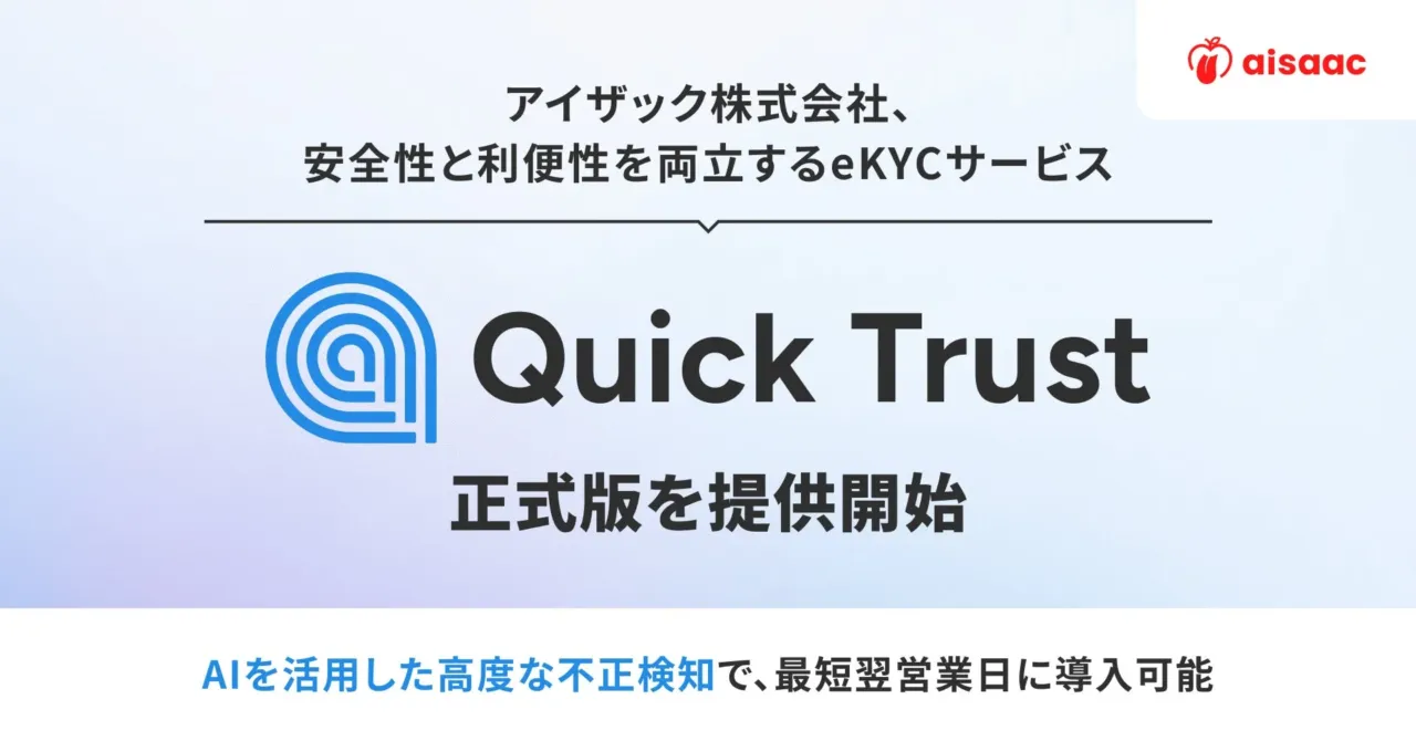 アイザック株式会社は、本人確認(eKYC)機能をAPIとして提供するSaaSプラットフォーム「Quick Trust」(クイックトラスト)の正式版提供を開始しました。