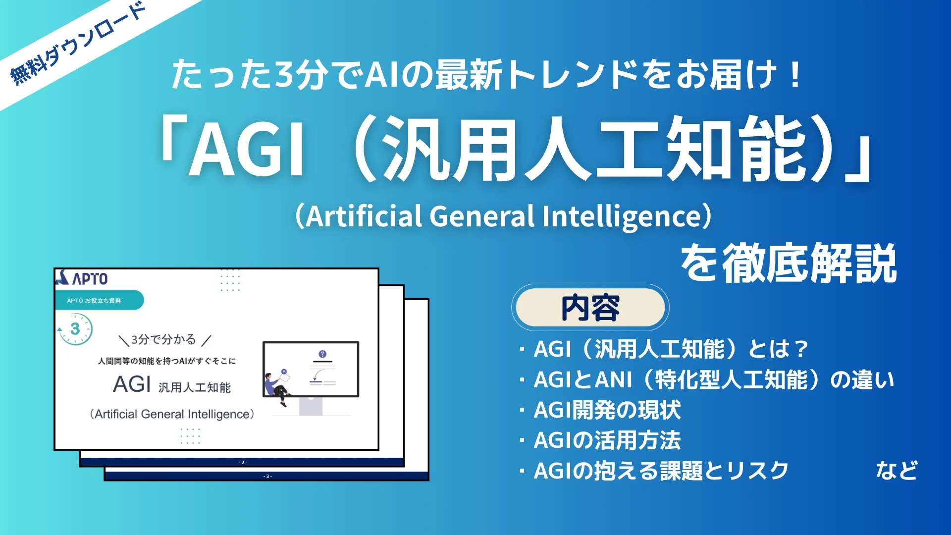 株式会社APTOは、AGI(汎用人工知能)に関する詳細な情報をまとめた資料を無料で公開しました。この資料は、AIの進化が加速する現代において、AGIがもたらす可能性と課題を理解するための貴重な情報源となるでしょう。