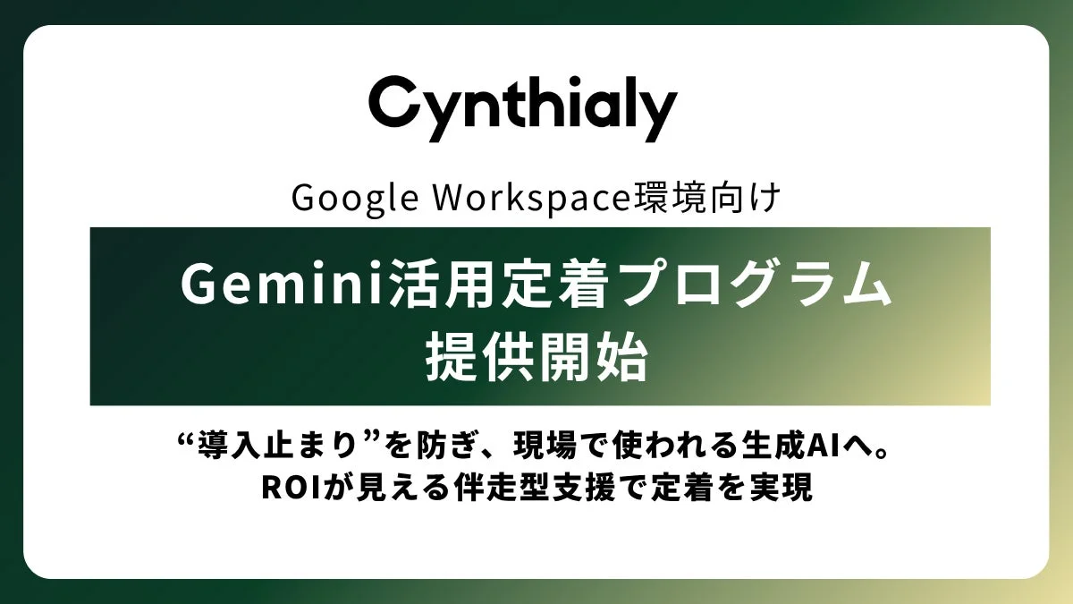 生成AIの導入が進む中で、多くの企業が直面しているのが「導入したものの、どう使えば良いのか分からない」「一部の社員しか使っていない」という“導入止まり”の課題です。Cynthialyの「Gemini活用定着プログラム」は、この課題に対し、単なるツール提供や研修で終わらせず、現場での具体的な活用とROIの可視化までを伴走するという点で、非常に実務的なアプローチを提供しています。特に、個人の活用レベル診断からプロンプト開発、そして具体的なROIの算出までをサポートする4ステップは、企業が生成AIを真の競争力に変えるためのロードマップとして有効でしょう。Google Workspace環境に特化している点も、多くの企業にとって導入しやすいポイントと考えられます。AIを「使う」から「成果を出す」フェーズへと移行したい企業にとって、検討する価値のあるサービスと言えます。