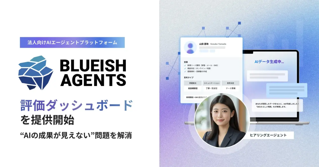 株式会社BLUEISHは、これらの課題の根本を「AIが実際に何を改善したのかが数字として残っていないこと」にあると捉え、この度『BLUEISH Agents』においてAIの稼働状況・成果・学習データを一元管理し、可視化する「評価ダッシュボード」を開発しました。