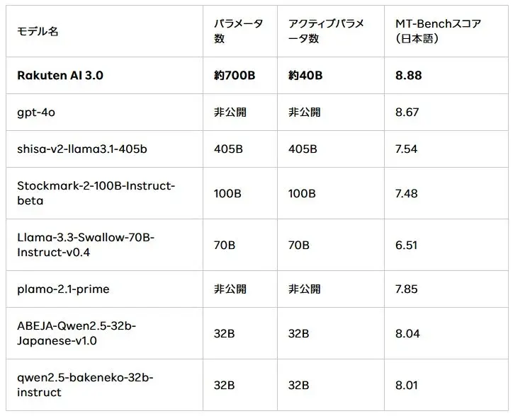 Rakuten AI 3.0 (LLM) と日本語に特化した主なモデルの比較