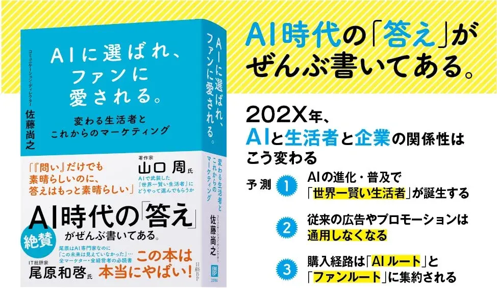 過去にインターネット普及による広告の未来を解き明かした『明日の広告』、情報社会・SNS社会における生活者の変化を説いた『ファンベース』に続き、今回はAI時代における広告やマーケティングの未来が予測されています。