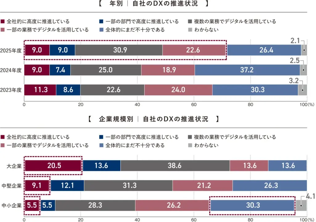しかし、ビジネスモデル、人材育成、経営判断といった各領域では、デジタル活用が定着し始めているものの、発展途上にあります。多くの企業が導入段階から定着へと移行する時期にあり、部分的な最適化から全社的な推進体制への転換が今後の主要な課題となるでしょう。