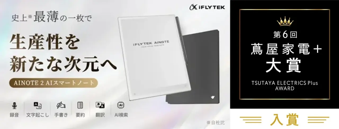 W入賞を果たした「iFLYTEK AINOTE 2」と「iFLYTEK AINOTE Air 2」は、iFLYTEK独自のAI技術を搭載した電子ペーパーです。手書きメモ、音声認識のテキスト化、要約、翻訳、読書機能が一台に集約されており、多岐にわたるビジネスシーンや学習環境での活用が期待されます。