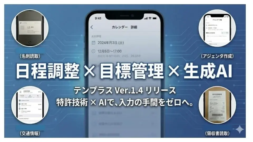 『テンプラス』は、この課題を解決するために開発されたサービスです。単にアポイントを入れるだけでなく、その予定がどの目標(KPI/OKR)に紐づいているかを可視化します。特許出願中の独自技術により、「目標」と「スケジュール」と「実績」を比較分析し、目標達成に必要なアクションをAIがサジェストする、全く新しい行動管理サービスとして展開されています。