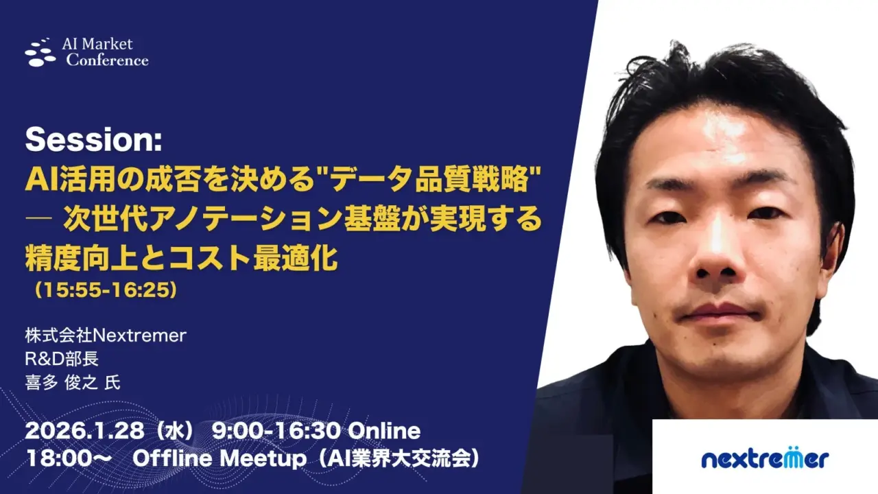 今回のNextremer社の講演内容は、AIをビジネスに本格導入しようとする企業にとって非常に重要な示唆を含んでいます。AIモデルの性能は学習データの品質に大きく依存するため、この「データ品質戦略」はAI投資対効果を最大化する上で不可欠です。次世代アノテーション基盤による効率化と品質安定化は、特に大量のデータを扱う製造業やサービス業において、AI導入の障壁を下げ、DX推進を加速させるでしょう。高品質なデータ生産体制の構築は、企業の競争力向上に直結すると考えられます。