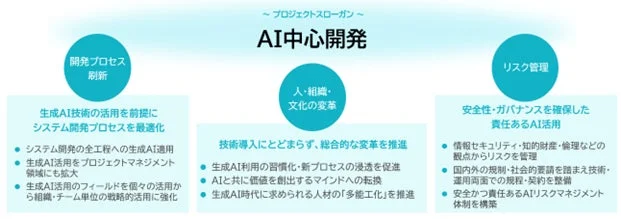 TISが掲げる「AI中心開発」は、従来のシステム開発プロセスに生成AIを最大限に活かす転換を目指し、以下の3つのテーマに沿って全社的な推進を図ります。