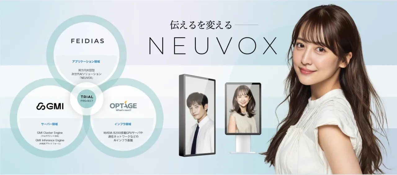 FEIDIASの「AIによる高精度な動画生成・音声処理技術」、オプテージの「AIインフラのワンストップ提供力」、GMI Cloudの「AIプラットフォーム構築技術」が一体となることで、労働力不足が深刻化する日本社会に対し、AIによる革新的なソリューションが提供されます。