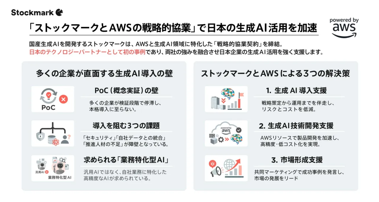 今回の協業により、ストックマークはAWSから営業、技術、マーケティングの多方面にわたる支援を受けます。AWSが持つ世界最高水準のAIインフラとストックマークの生成AI技術が融合することで、セキュリティや人材不足の課題を抱える日本企業のDXを強力に支援し、生成AIの社会実装を加速させていく方針です。