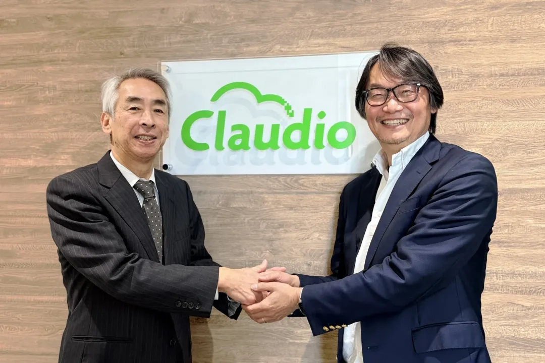 ビジネススーツを着た2人の男性が笑顔で握手をしている。背景には「Claudio」のロゴがあり、ビジネス上の合意や協力関係を示唆するプロフェッショナルな雰囲気の画像である。