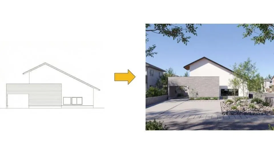 「AI real CG」は、これらの課題を解決するために開発されました。手描きの図面や現地写真をもとに、実写のようなCGパースを自動生成するサービスです。これにより、集客においては自社が理想とする外観パースをInstagramなどで発信し、商談においては「この家がこの場所に建つ」というイメージを顧客にリアルに伝えられるようになります。