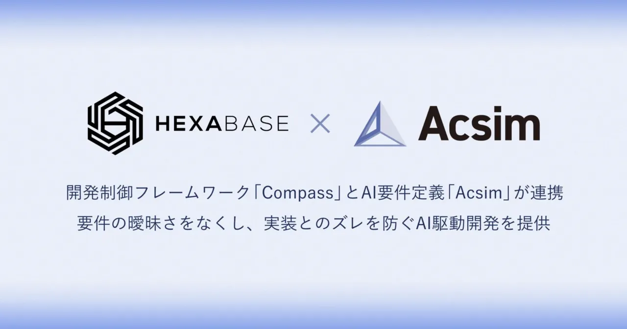 株式会社Hexabaseが提供するAI駆動開発フレームワーク「Compass(コンパス)」と、株式会社ROUTE06が提供するAI要件定義「Acsim(アクシム)」は、サービス連携を開始しました。この連携により、「Acsim」で構造化された要件データが、仕様に基づいて実装を制御する「Compass」へシームレスに引き渡されます。