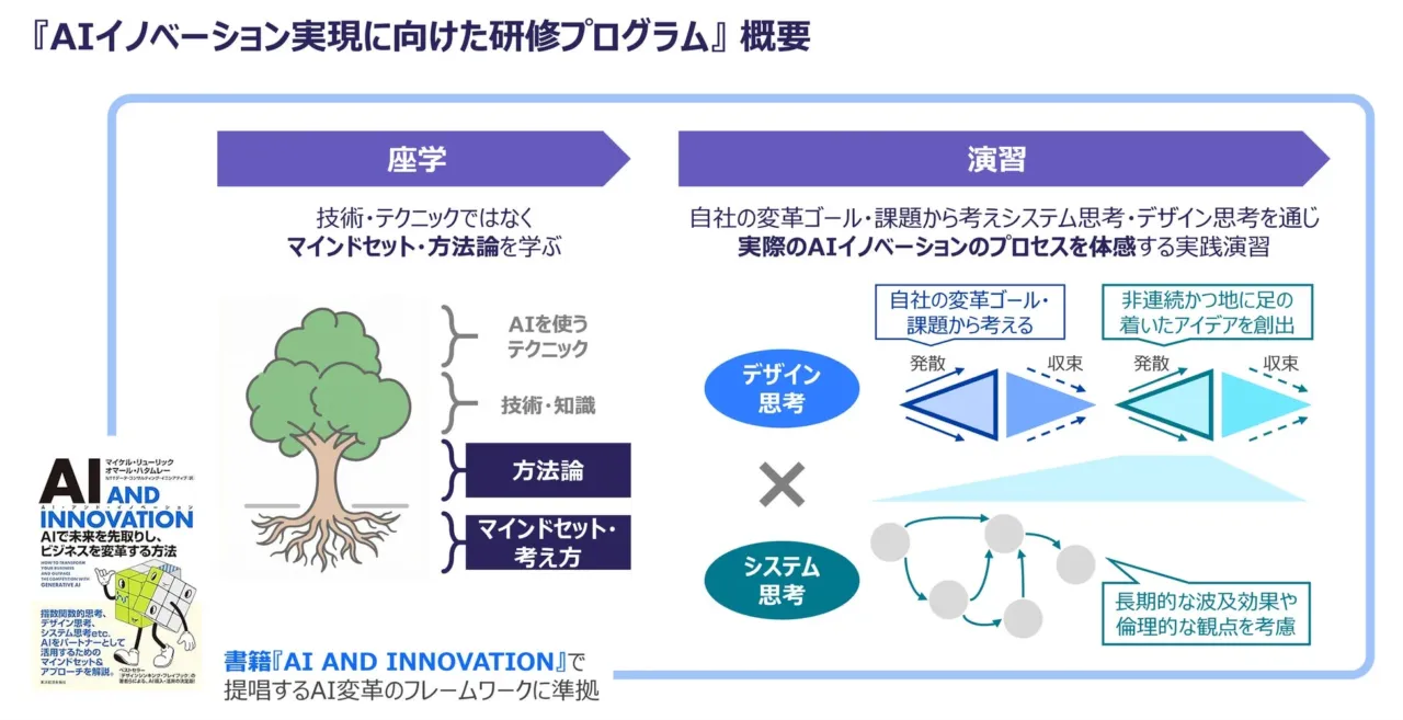 本研修プログラムで展開されるマインドセット、考え方、方法論は、デザイン思考の世界的ソートリーダーであるマイケル・リューリック氏らの書籍『AI AND INNOVATION』に準拠しています。本書の翻訳に携わったメンバーが研修プログラムをデザインしており、グローバルの先端知見とコンサルティングの知見が融合された効果的な内容となっています。 - 「わかる」を「できる」に変える演習主体の設計