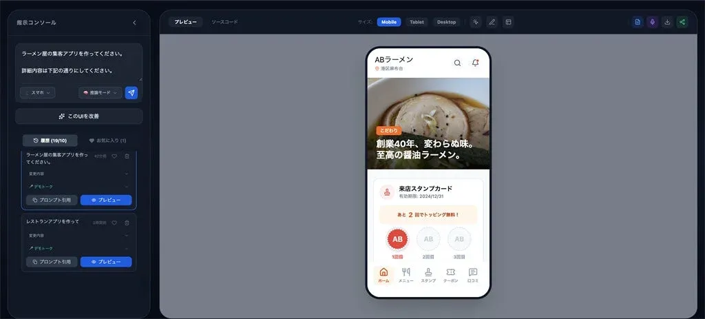作成したいアプリの特徴やイメージを自然言語で入力するだけで、デバイス別に最適化されたモックアップを最短3分で作成可能です。営業職や企画職の方が、専門的なデザインツールの知識なく、その日から直感的に操作できる設計となっています。