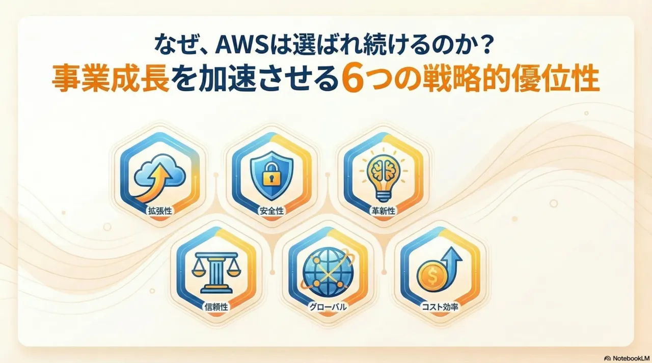 本ガイドでは、AWSの戦略的優位性を以下の6つの視点から詳細に解説しています。