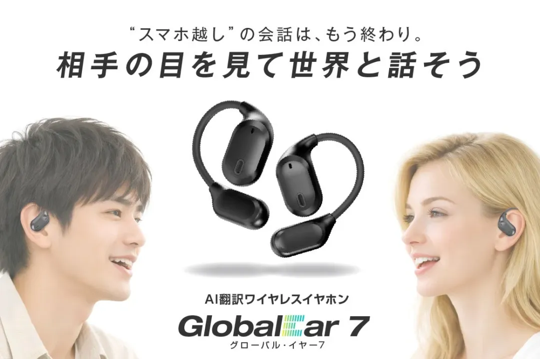 「GlobalEar 7」は、耳に装着するだけで世界150言語を98%の高精度で自動翻訳するAI翻訳ワイヤレスイヤホンです。最短0.3秒という爆速レスポンスにより、同時通訳に近い感覚で自然なコミュニケーションが可能になります。