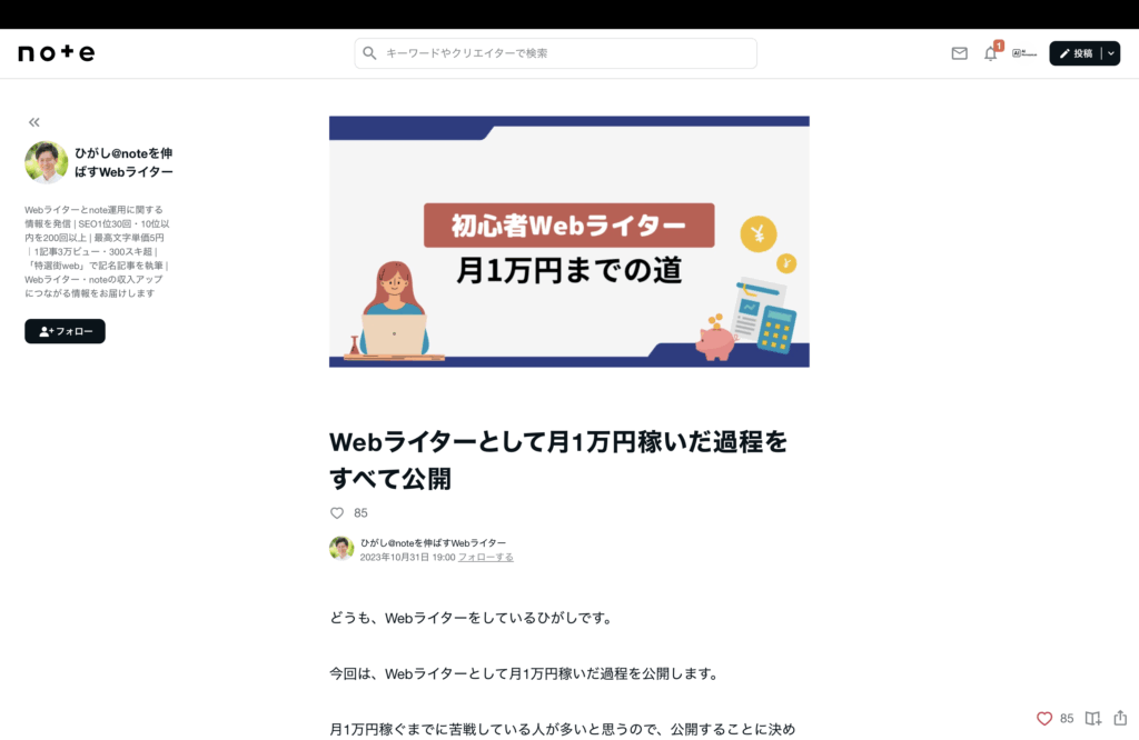 実例として、Azuki_coffee氏は副業(週10〜15時間)で月5万円に到達しています。(出典:https://note.com/moral_gecko6737/n/n8cd227ef4194)