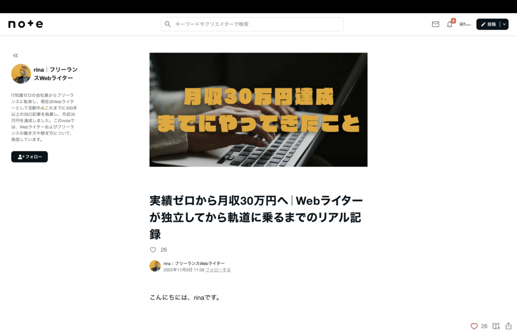 実例では rina氏が専門ジャンルで3〜5円へ到達しています。(出典:https://note.com/rina_vivir/n/n43361cd600b9)