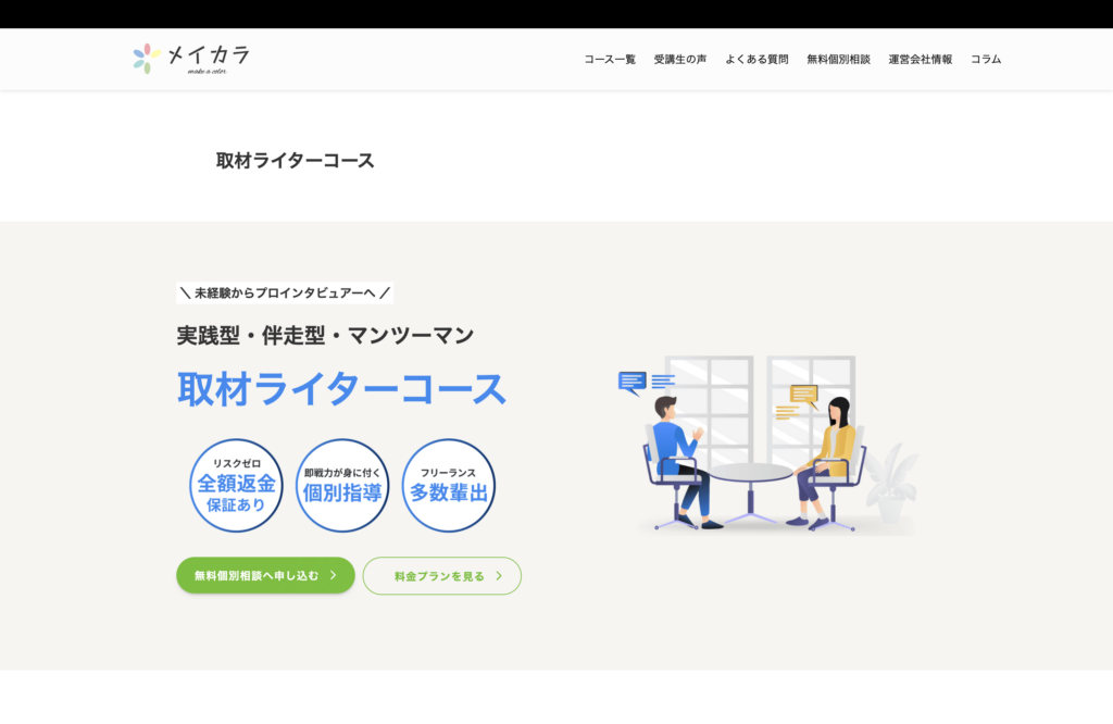 メイカラの「取材ライターコース」は、未経験からインタビュー記事を作れる実践型のオンライン講座です。