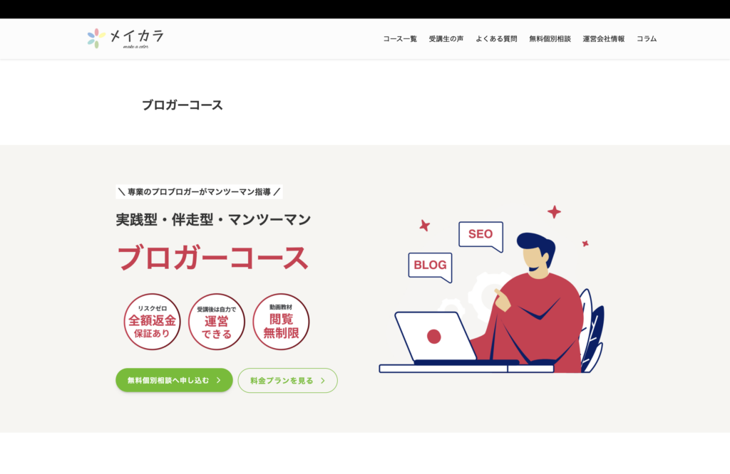 メイカラのブロガーコースは、SEO・アフィリエイト・文章力を体系的に学べる実践型のオンライン講座です。