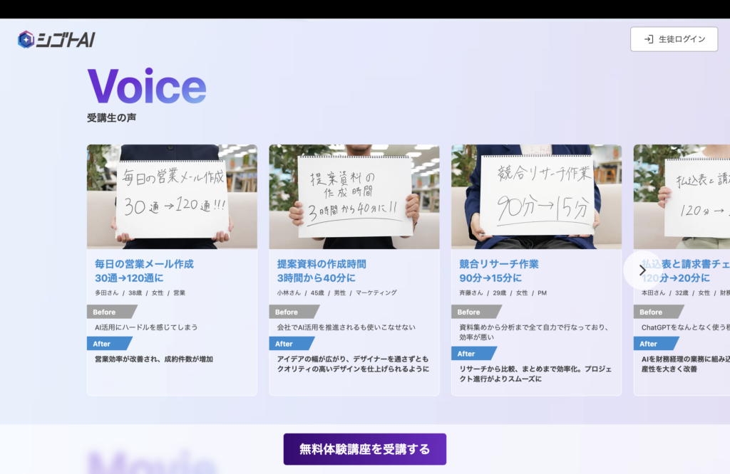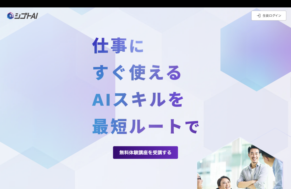 シゴトAI オンラインAIスクール紹介ページ(料金・提供内容・受講生事例)