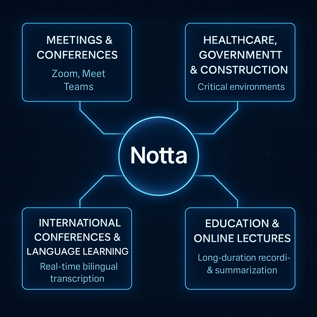 AI文字起こしツールの中でも、Nottaは 会議自動化・要約・翻訳・連携・現場運用 まで一気通貫で完結します。