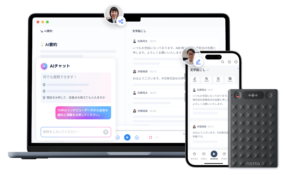 - 録音データはNottaアプリへ転送され、高精度テキスト・要約へ自動変換。